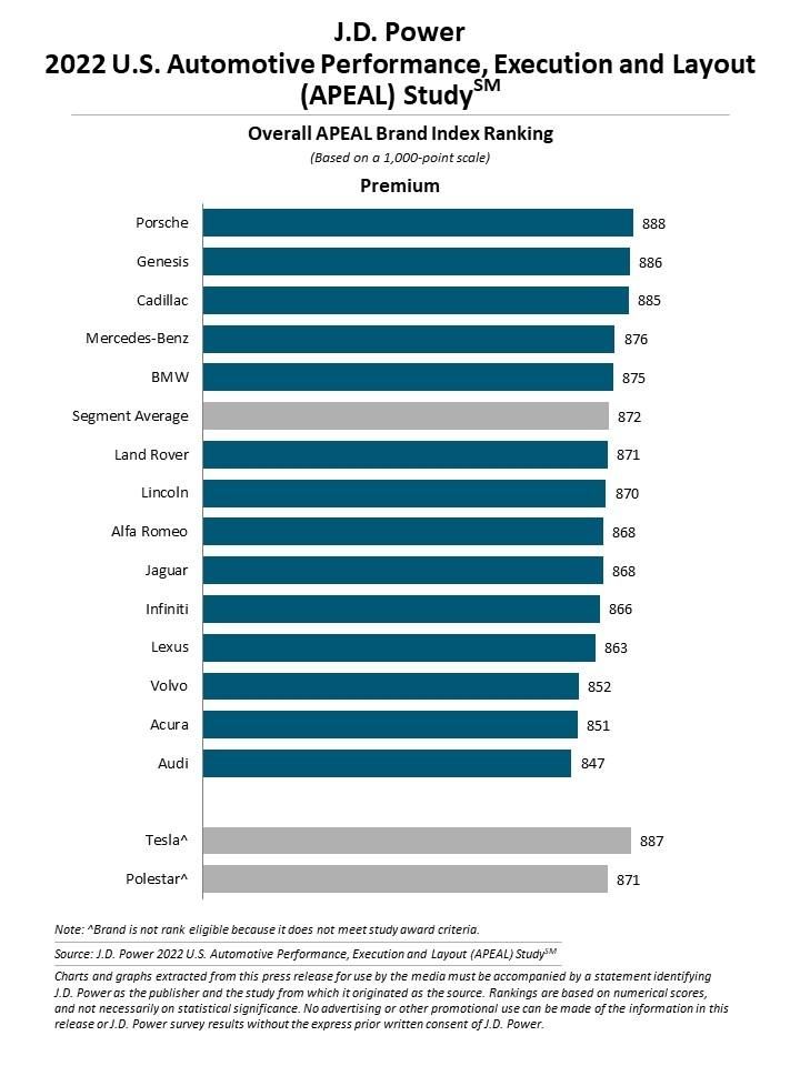 The top rated brand for appeal in 2022 was Porsche with a score of 888, followed by Genesis at 886, and Cadillac at 885. Dodge, Ram, and GMC topped the list for mass-market brands.